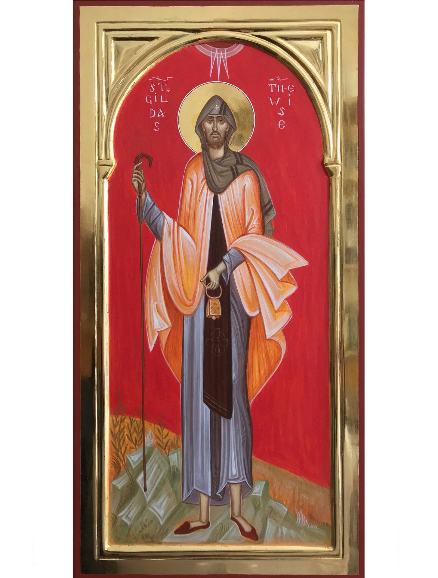 Gildas (c.494-?570/581) was a monk and vigorous missionary. whose family were of the Royal line of Strathclyde -still a British-speaking kingdom at that time, part of the Old North or Hen Ogledd. Trained by St Illtud at Cor Tewdus (The College of Theoderic), Gildas went on to Ireland where he completed his education and was ordained. According to an early 9th century life by an anonymous Breton monk,he is said to have made a bell for St Brighid of Kildare, and to have helped King Ainmire of Ireland reestablish the order of Christian worship. He visited Rome and Ravenna, and after a mission in the North of Britain, he came to Brittany where he established a hermitage and a church in Morbihan.