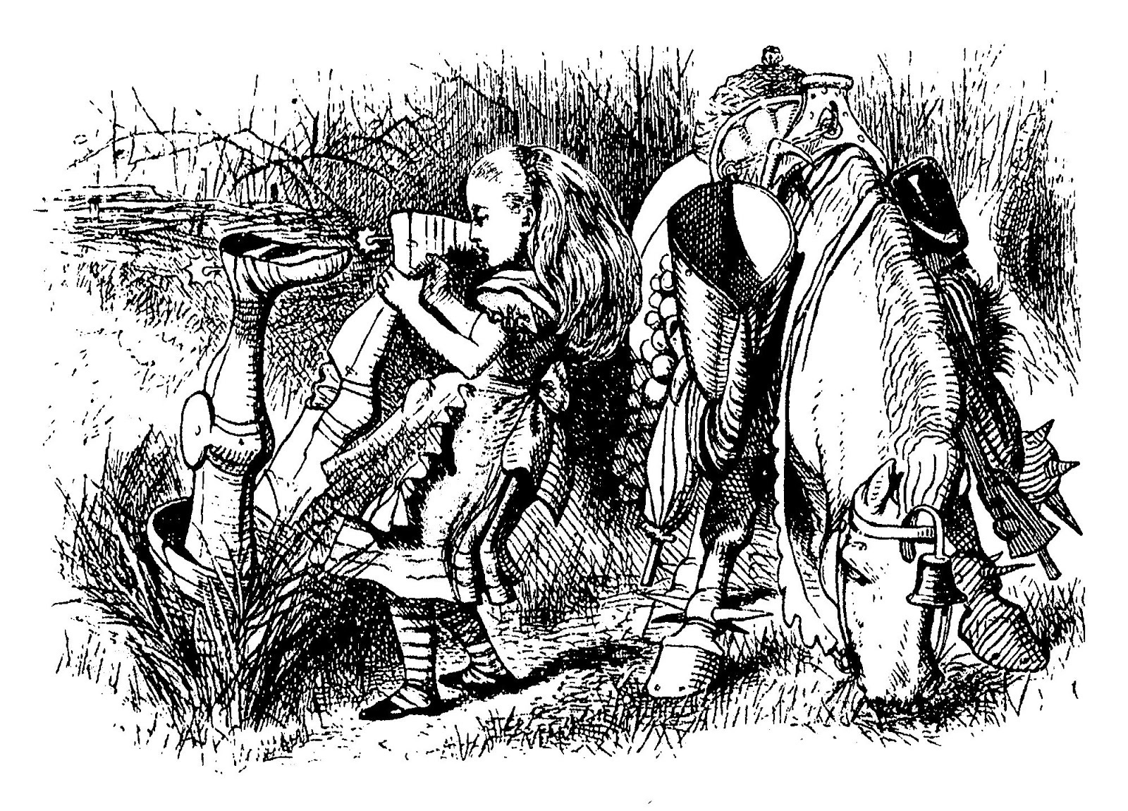 “Alice thought she had never seen such a strange-looking soldier in all her life. He was dressed in tin armour, which seemed to fit him very badly, and he had a queer-shaped little deal box fastened across his shoulder, upside-down, and with the lid hanging open. Alice looked at it with great curiosity.
